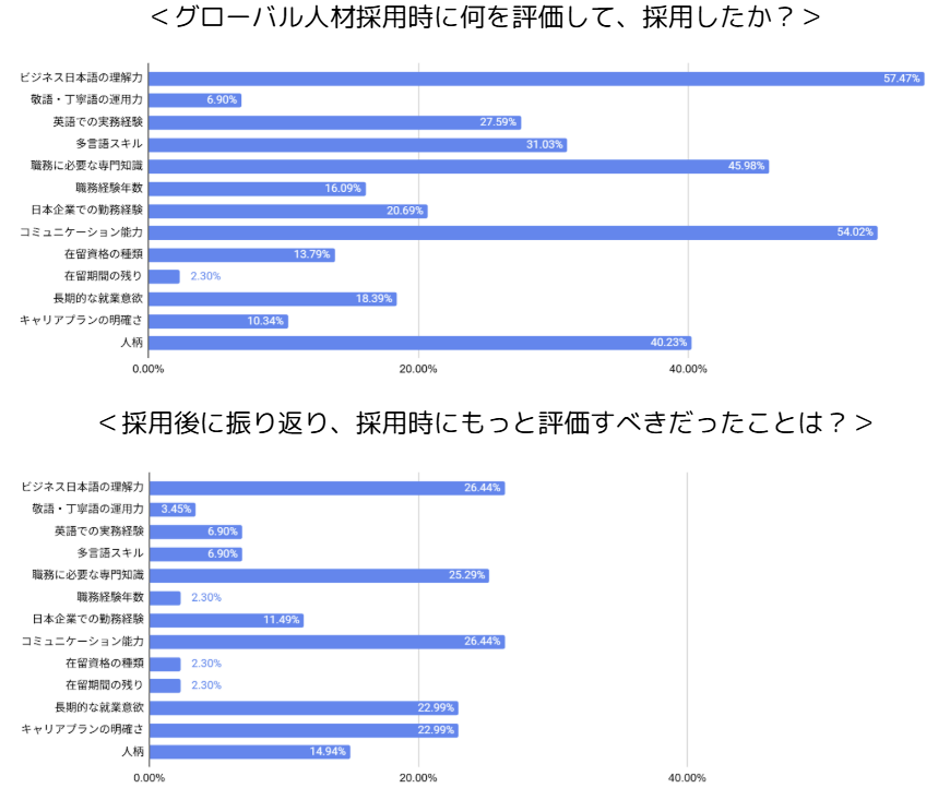 上記は唯一増加傾向を示しました。これは、採用段階ではスキルや言語能力が重視される一方、実際に活躍・定着している人材の共通点として「長期的なキャリア志向」が重要であることを示しています。